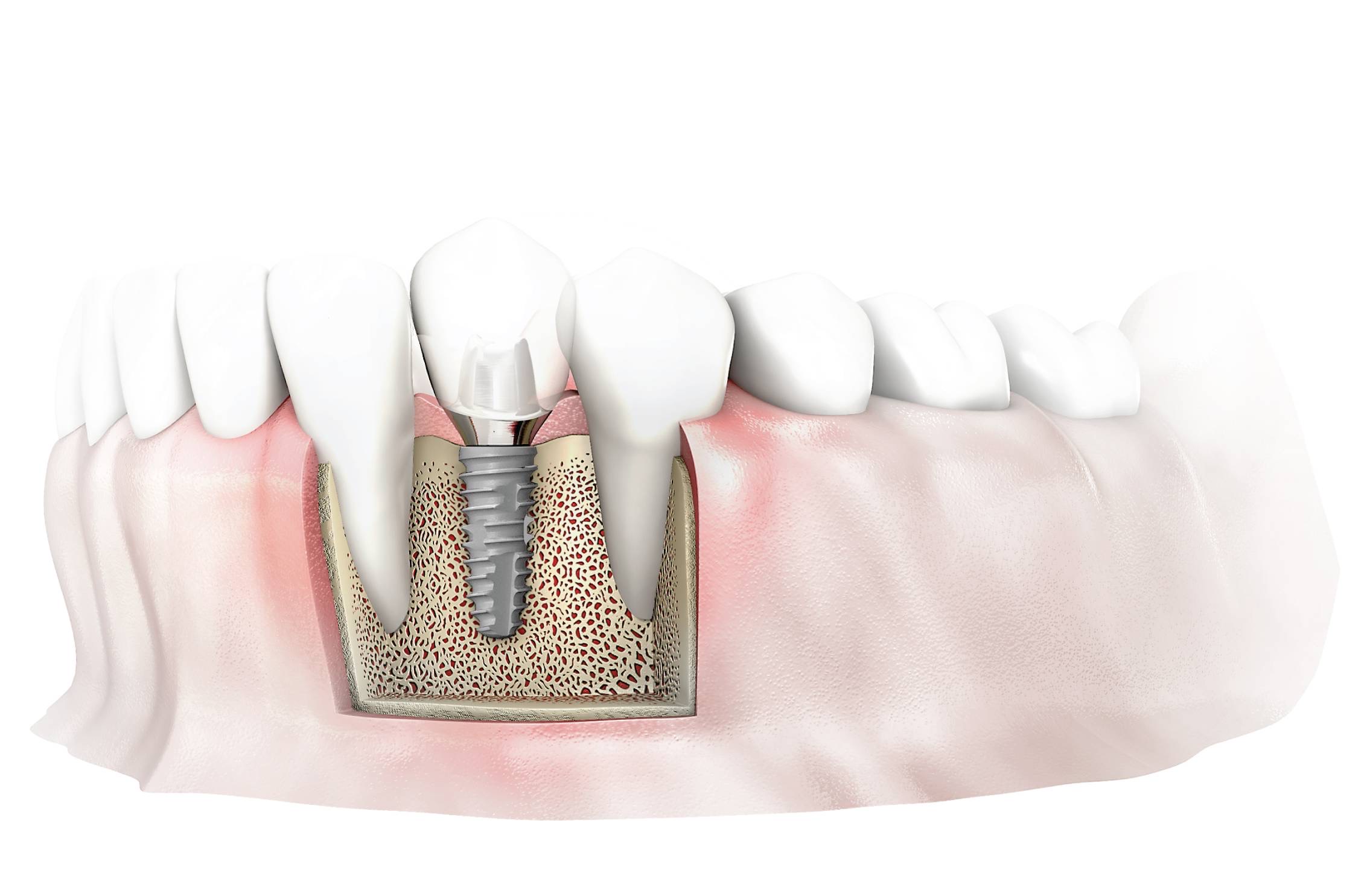 2. การผ่าตัดฝังรากฟันเทียม: ทำการฝังรากเทียมลงในกระดูกขากรรไกร อาจจำเป็นต้องมีการปลูกถ่ายเนื้อเยื่อเหงือก (Soft tissue grafting) และการปลูกถ่ายกระดูก (Bone Grafting)เพิ่มเติม ซึ่งจำเป็นในกรณีที่กระดูกขากรรไกรบางหรือมีปริมาตรไม่เพียงพอ